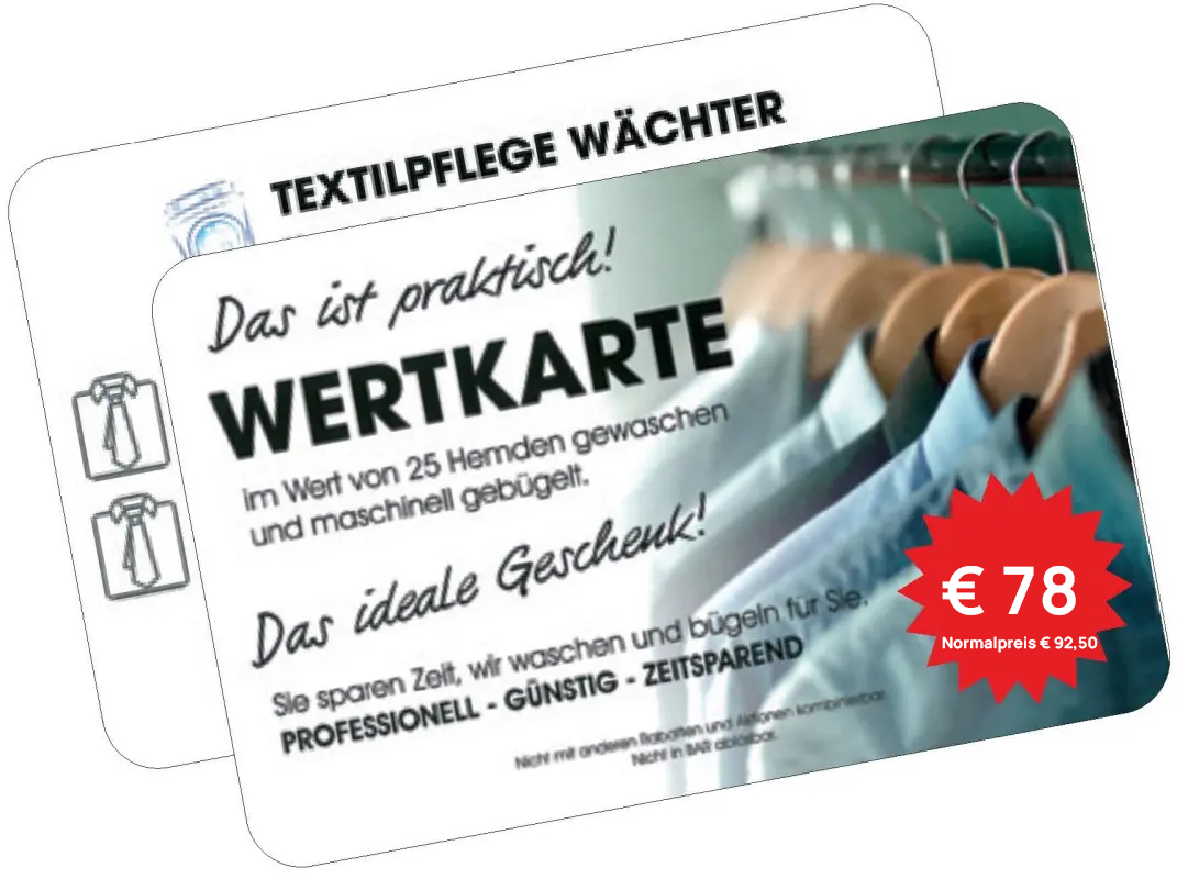 Bügeln raubt Zeit und Nerven. Mit unserer Hemden-Wertkarte bieten wir Ihnen einen kostensparenden und effizienten Service an.